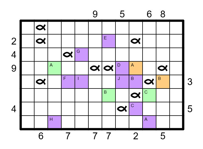 Im Diagramm sind Angelschnüre zu platzieren, die jeweils bei einem Angler (dargestellt durch die Hinweiszahlen) beginnen, waagerecht und senkrecht von Feldmittelpunkt zu Feldmittelpunkt verlaufen und bei einem Fisch enden. Kein Feld wird mehrmals durchlaufen und jeder Fisch wird von genau einem Angler gefangen.