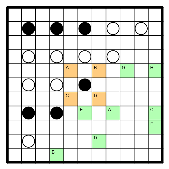 In Feldern mit einem schwarzen Kreis muß der Rundweg abbiegen und in den Feldern davor und danach geradeaus verlaufen, in Feldern mit einem weißen Kreis muß er geradeaus verlaufen und in mindestens einem der Felder davor oder danach abbiegen.